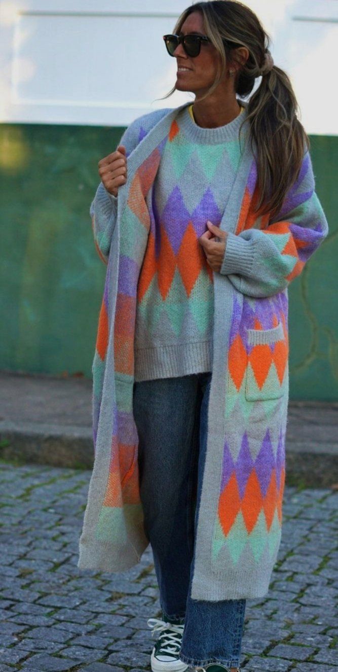 Jersey con estampado de rombos, todo ello acompañado de un chaquetón de punto del mismo estilo.