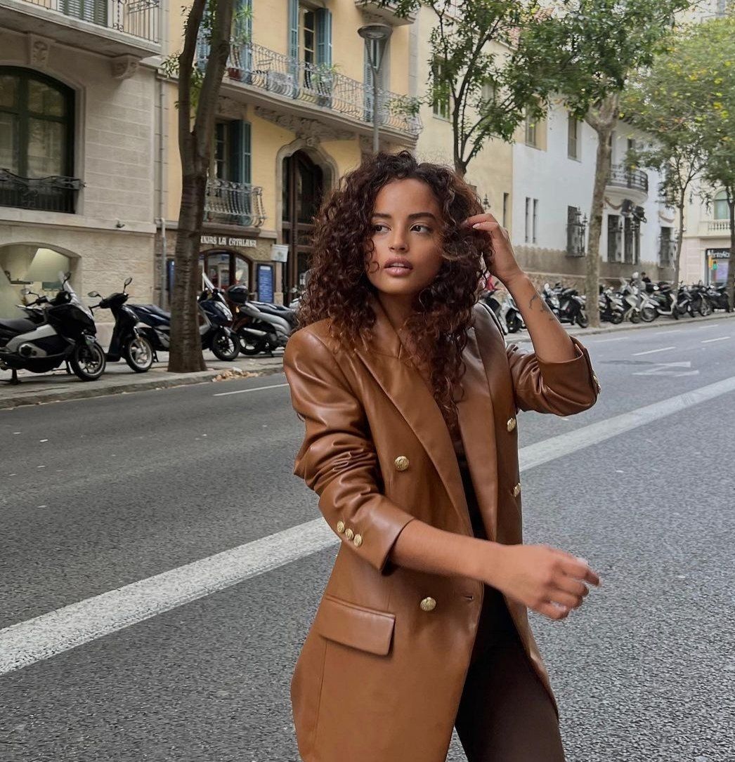 No nos olvidemos que estamos en pleno invierno, por lo que el frío estará presente mucho tiempo. Os proponemos este look: unos pantalones de cuero negro, acompañados de un jersey de manga negra larga y un abrigo largo beige, el cual será el protagonista del outfit.