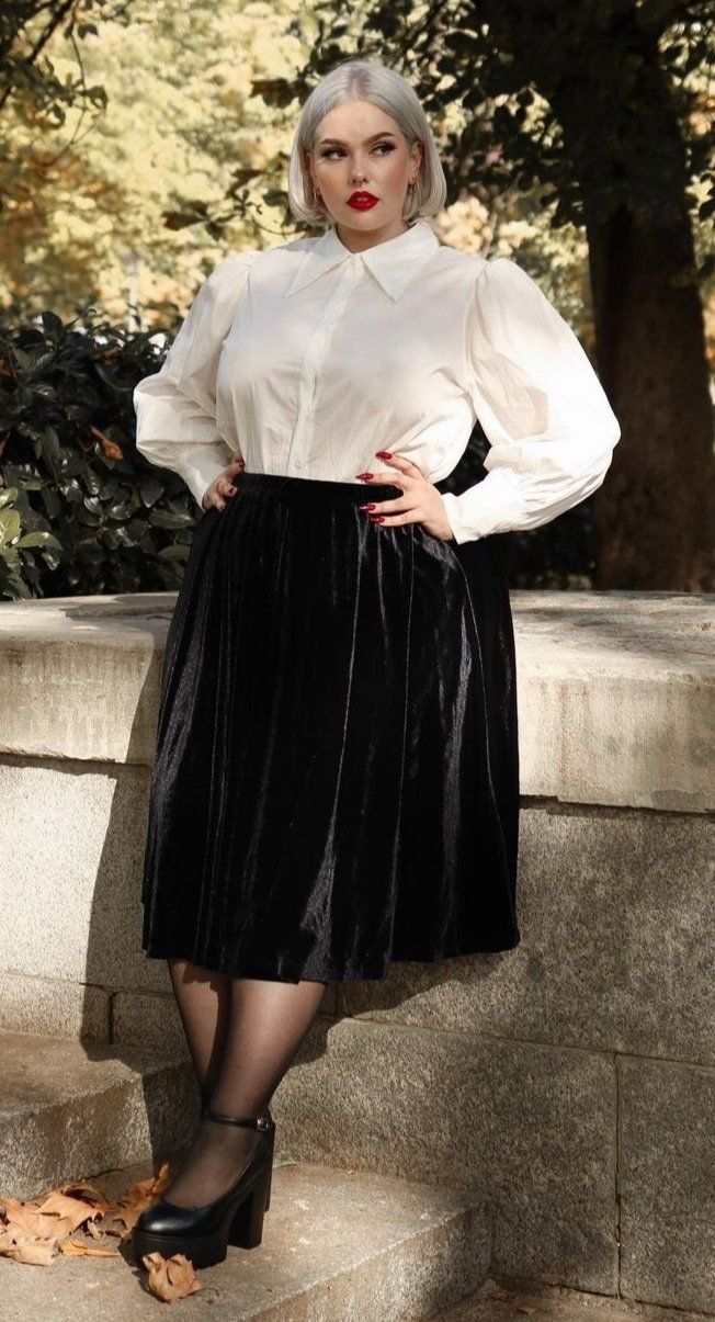Una camisa con cuello de bebé y una falda negra larga plisada será el look perfecto para hoy.