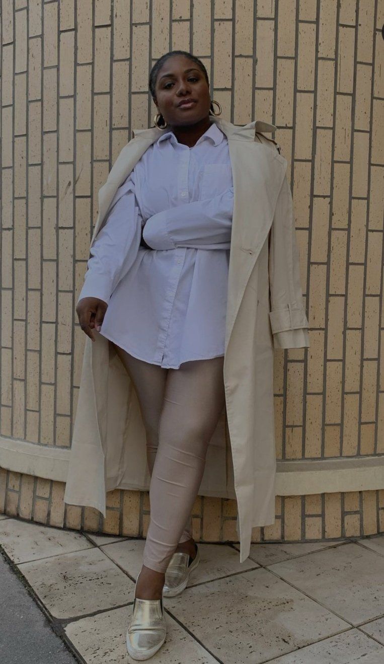 Conseguiremos un look cómodo una camiseta blanca básica, unos vaqueros azul marino y una gabardina de tono azul y beige.