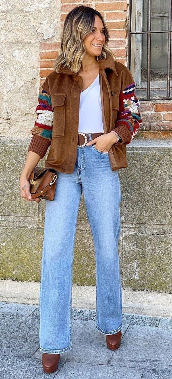 Una camiseta blanca, unos vaqueros claros y una chaqueta de pana marrón con detalles es todo lo que vamos a necesitar.