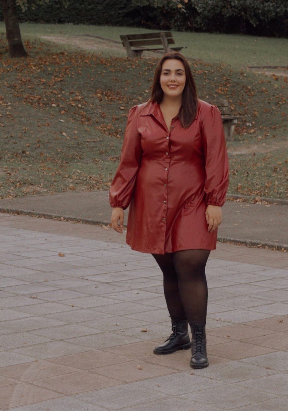 Un vestido de cuero rojo, con medias y botas negras es perfecto para hoy.