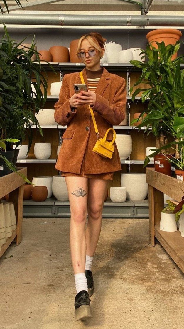 Este traje de pana marrón es perfecto para hoy. Se acompaña de un jersey de rayas horizontales.