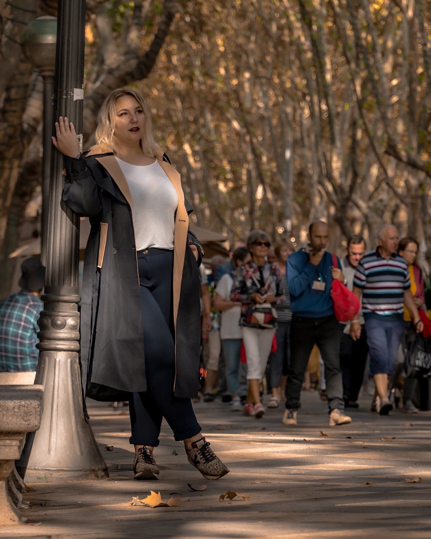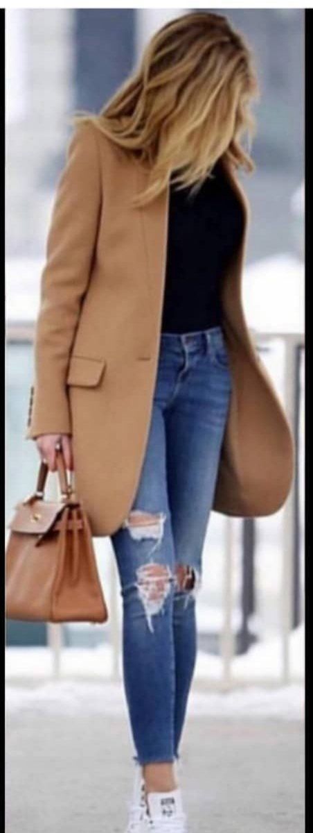 Hoy podemos ponernos un outfit sencillo. Un jersey negro, vaqueros, zapatillas o tacones negros, y una americana larga beige. Todo ello combinado con un bolso del mismo color que la americana.