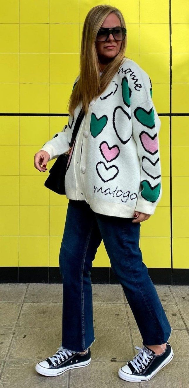 Con un cárdigan con corazones y unos vaqueros triunfarás.