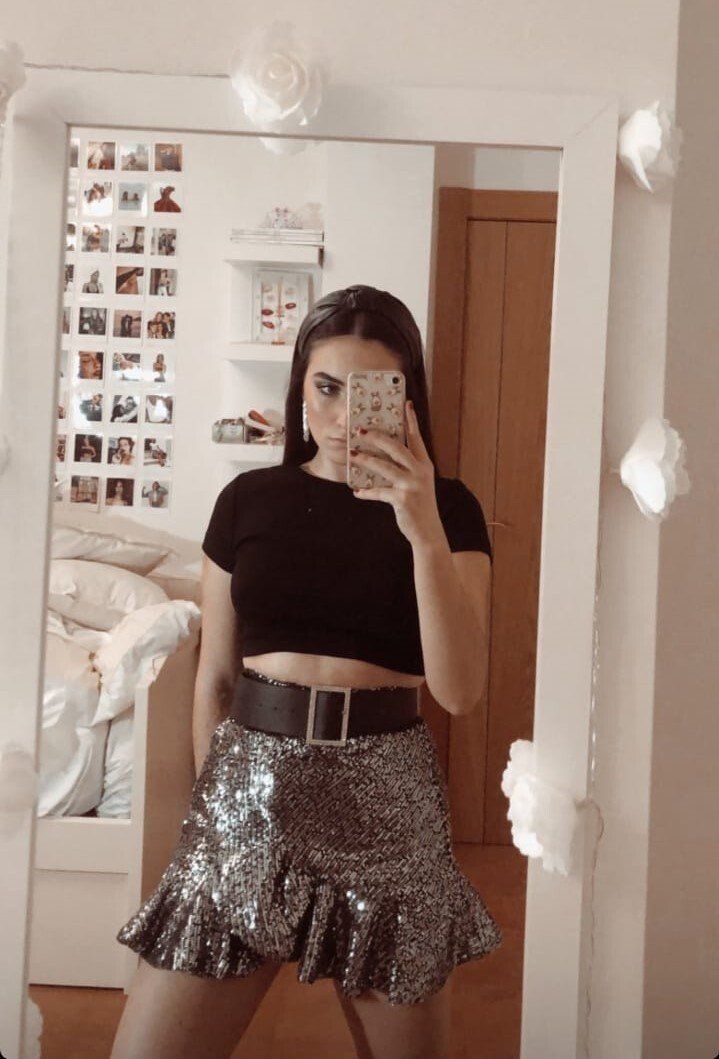 Hoy es Nochebuena. Os proponemos un look muy brillante, dando el protagonismo a la falda, llena de brillos. Se acompañará con un abrigo largo negro.