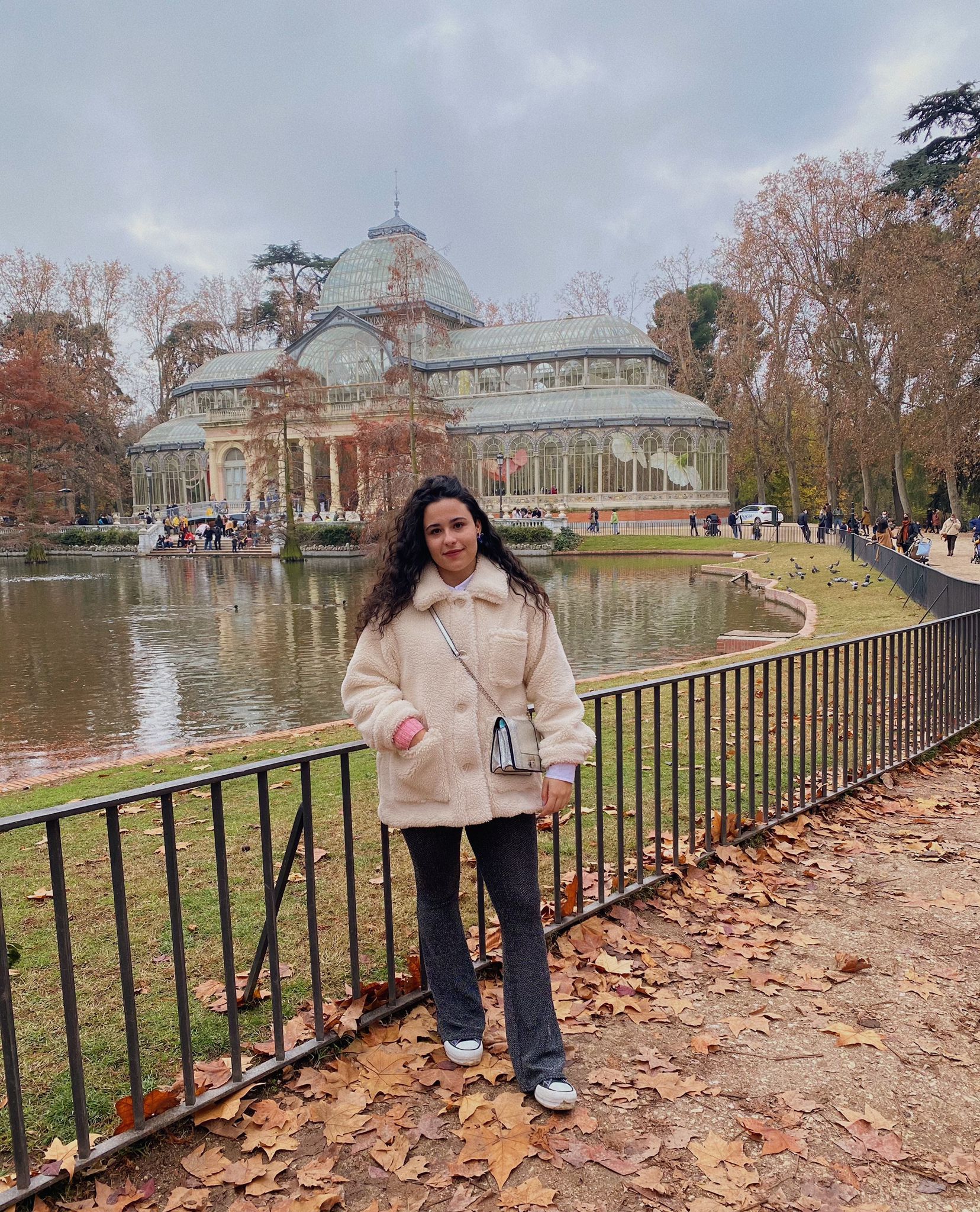 Un abrigo “tedy bear” y unas mallas anchas con brillo son perfectas para hoy.