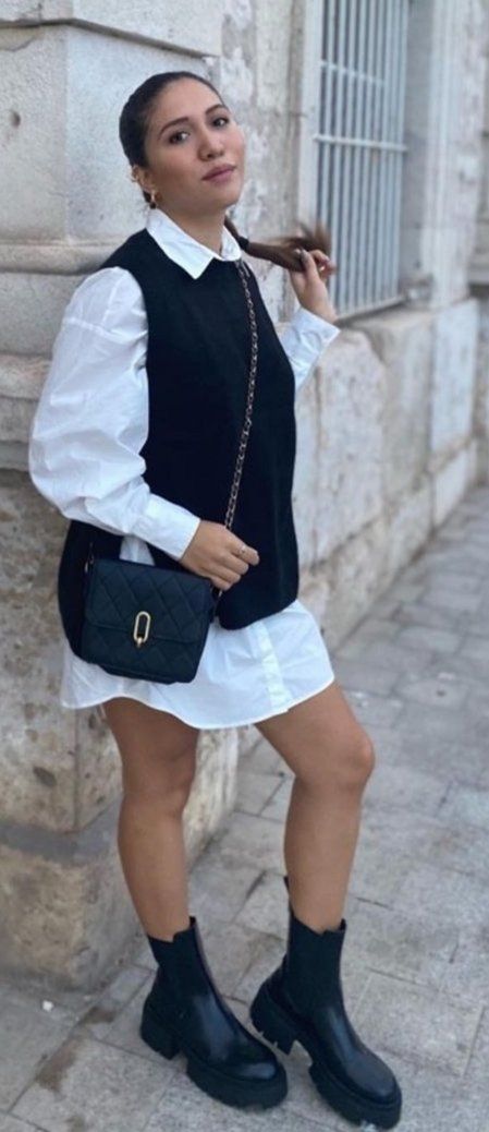 Optaremos por una camisa oversize, acompañándola de un chaleco de punto negro y unas botas negras. Para las más frioleras es recomendable unas medias transparentes o negras.