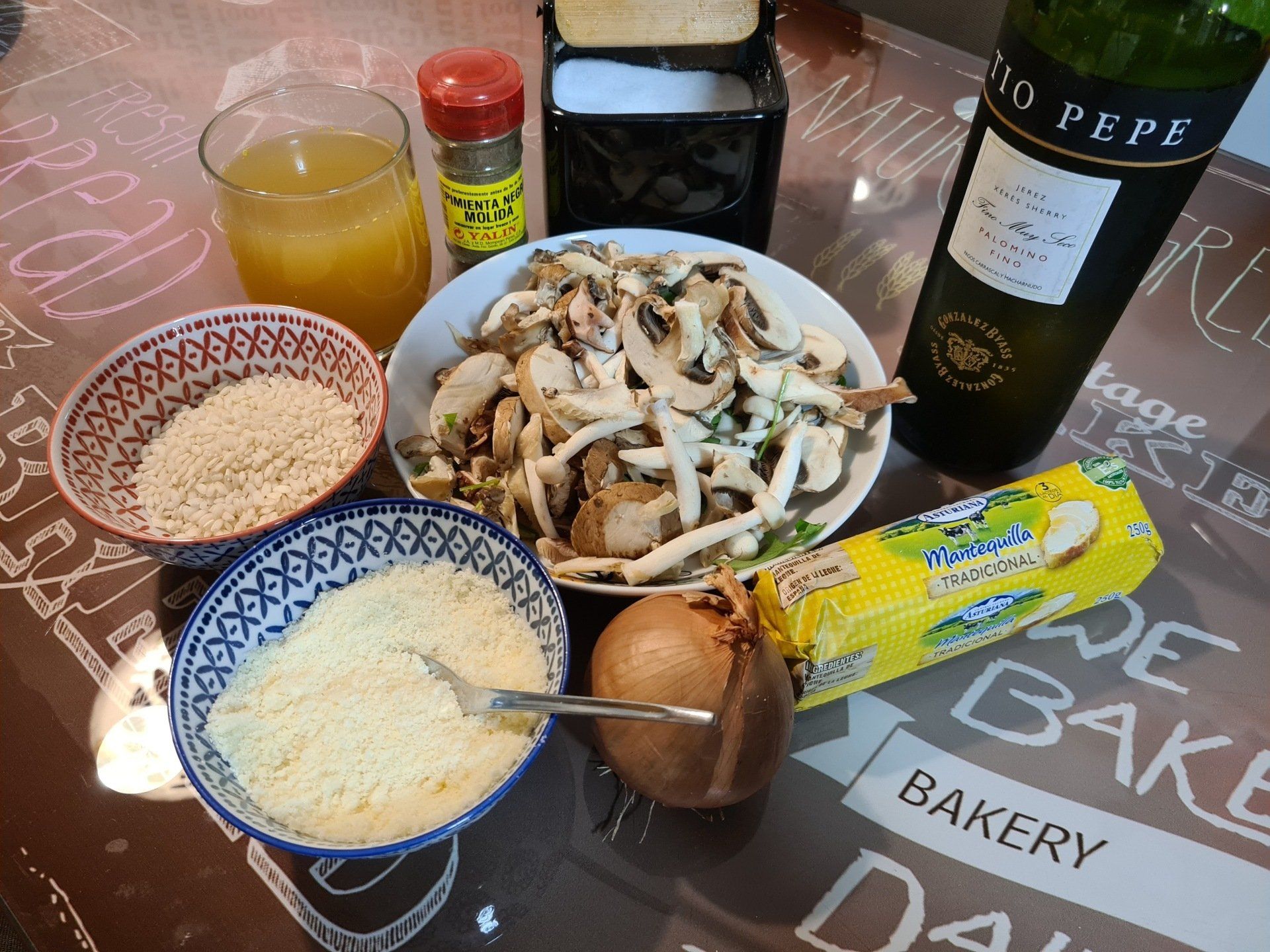· Añadimos la cebolla en brunoise fina y dejamos que se poche un poco hasta que esté trasparente. Añadimos las setas y los champiñones y los salteamos un poco. Salpimentamos.