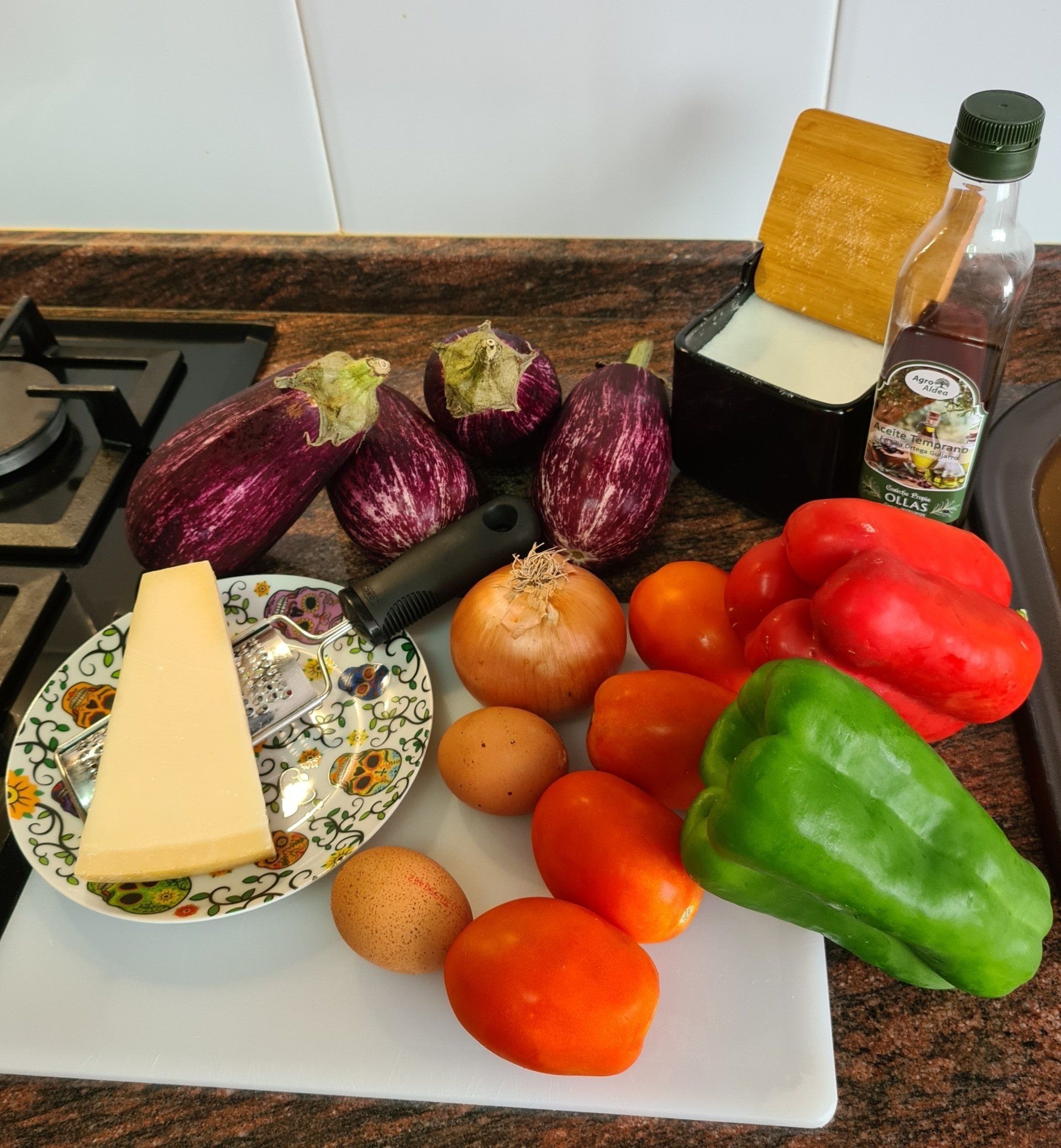 PASO 1: Cortamos las berenjenas por la mitad a lo largo y vaciamos las berenjenas con cuidado, cortando la pulpa en trocitos pequeños y reservamos las barcas, hacemos la cebolla en una brunoise fina (trocitos pequeñitos), cortamos los pimientos en dados pequeños(limpios de pepitas), pelamos los tomates y cortamos en trocitos pequeños.