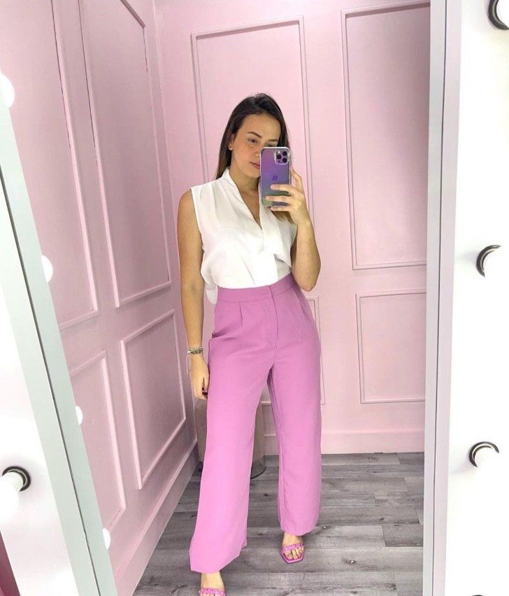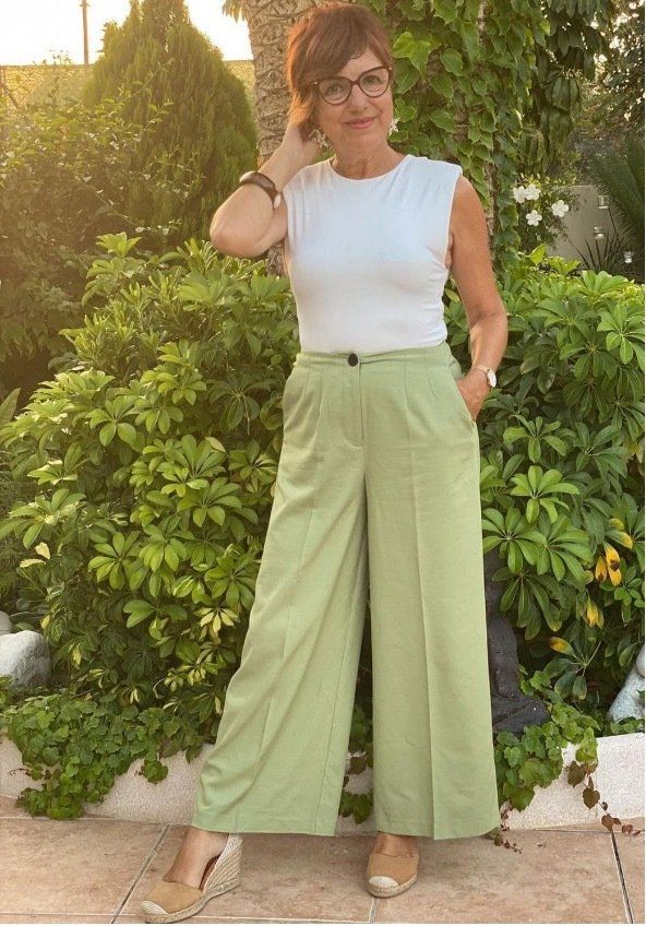 Body blanco con hombreras de Zara. Pantalón verde de Bershka. Sandalias con cuña de @calzadoscanaleta.