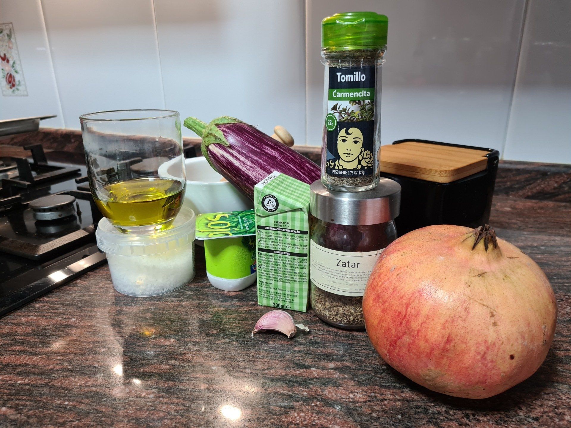 o Ponemos la berenjena en un plato y añadimos la salsa por encima. Espolvoreamos el zatar al gusto, un poco de tomillo y las granadas.