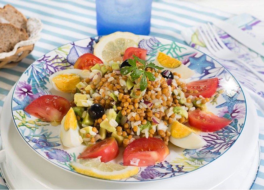 Después se prepara la ensalada disponiendo en un cuarto del plato el arroz, en otro cuarto lentejas y en la mitad restante el aguacate y el tomate, dejando el huevo hervido para decorar la parte central de la ensalada y el aceite de oliva junto al zumo de limón y sal para rociar por encima de todos los ingredientes.